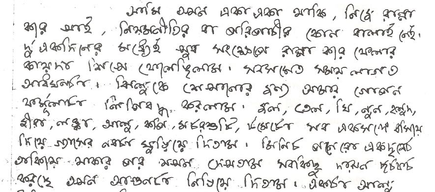 আমি তখন একা একা থাকি, নিজে রান্না করে খাই, নিয়মনীতির বা পরিপাটীর কোন বালাই নেই। দু-একদিনের মধ্যেই খুব সংক্ষেপে রান্না করে ফেলার কায়দা শিখে ফেলেছিলাম। সবসমেত সময় লাগত আধঘন্টা। ঝিলুকে শেখানোর জন্য আমার গোপন ফর্মুলাটা লিপিবদ্ধ করলাম। জল, তেল, ঘি, নুন, হলুদ, জীরা, লঙ্কা, আলু, কপি, মটরশুঁটি, টমেটো সব একসঙ্গে বসিয়ে দিয়ে, গ্যাসের নব্টা ঘুরিয়ে দিতাম। মিনিট পনেরো একদৃষ্টে তাকিয়ে থাকার পর যখন দেখতাম সবকিছু দারুন ছটফট করছে, তখন আগুনটা নিভিয়ে দিতাম। একটা আলু উঠিয়ে চামচ দিয়ে চাপ দিয়ে দেখে নিতাম পুরোপুরি নরম হয়েছে কিনা। ব্যাস! এরপর ভাত। এরজন্য আলাদা কুকার আছে। এককৌটো চাল আর দেড় কৌটো জল, একবার শুধু স্যুইচটা টিপে দিলেই আর কোন হিসেব রাখার দরকার হবে না। রান্না শেষ! যখন খুব ক্ষিদে পেত তখন একটু খেয়ে নিতাম। একবার রান্না করলে তিনদিন আরাম। তখন ভাবতাম কিভাবে লোক এই খাওয়া-দাওয়ার পিছনে প্রায় সমস্ত সময় কাটায়। অবশ্য অন্যকে দোষ দিয়ে কি হবে আমার সময় যে কিভাবে কাটতো তা আমি নিজেই জানতাম না। নিজে নিজে রান্না করে খাওয়ার এই দুর্লভ সুযোগ আমার জীবনে আসার কারণ ছিল শিল্পা, সুমেধা ও লক্ষ্মীর অনুপস্থিতি। ওঁরা সবাই গরমের ছুটি কাটাচ্ছিল সুইজারল্যান্ডে ইউজী কৃষ্ণমূর্তির সঙ্গে। আর আমি দিনগত পাপক্ষয় করতাম ল্যাবরেটরিতে বিভিন্ন যন্ত্রপাতির নব ঘুরিয়ে, কম্পিউটারের মনিটারের দিকে তাকিয়ে, নয়ত কাগজের উপর কলমের হিজিবিজি কেটে। আমার কাছে এসব কাজের অবশ্য কোনো মূল্যই ছিলনা। জীবনের সেই সময় এক রাতে সিনেমা দেখার মত পরিষ্কার এই স্বপ্নটা দেখেছিলাম – তাহলে শোন্ এবার স্বপ্নটা আর হাল্কা মনে প্রাণ খুলে হেসে যা।